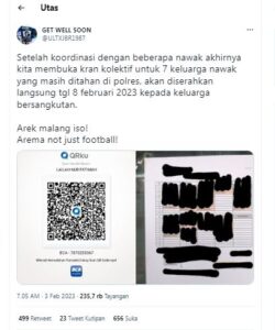 Sikap dan kepeduliaan Arek-arek Malang dan kawan-kawan di Luar Kota kepada perjuangan keluarga korban Tragedi Kanjuruhan serta ketujuh kawan yang ditahan patut direalisasikan dalam rangkaian solidaritas horisontal kali ini. Pengumpulan dana solidaritas akan ditutup pada tanggal 8 Februari 2023 dan diserahkan kepada seluruh keluarga tahanan dengan setara. Masing-masing domisili tahanan: 5 orang Dampit, 1 orang Pakis, dan 1 orang Pujon.