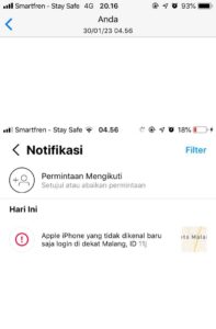 Berikut adalah bukti tangkapan layar bahwa akun instagram narasumber mendapatkan notifikasi masuk dari perangkat lain di saat pemeriksaan.